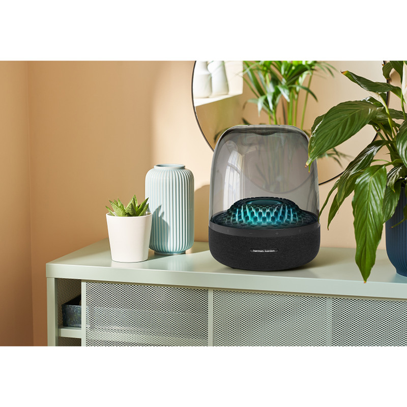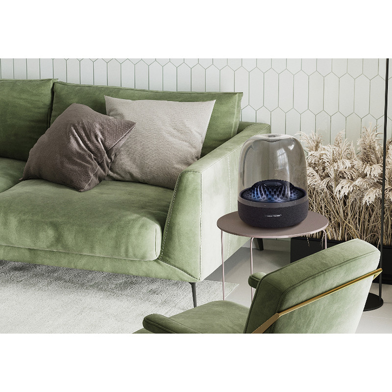 هارمن کاردن آئورا استودیو 4 در میان دیگر اسپیکرهای هم رده خود از کیفیت بالاتری برخوردار است. این اسپیکر بلوتوثی با طراحی 360 درجه، قابلیت نمایش موسیقی را در سراسر اتاق فراهم میکند. به طوری که اگر آن را در وسط اتاق قرار دهید صدا به اندازه یکسانی در فضا پخش می شود. Aura 4 با توان خروجی 130 واتی خود صدای چشمگیری را به گوش شما می رساند. همچنین به لطف سیستم صوتی پیشرفته و توانمندی که دارد به شما اجازه می دهد آهنگ های مورد علاقه خود را به صورت 360 درجه گوش کنید. اگر به موسیقی های آکوستیک علاقه مند هستید؛ قطعا Aura Studio 4 یکی از بهترین گزینه ها برای شماست. علاوه بر این باس فوق العاده آن شما را شگفت زده خواهد کرد. در پشت اسپیکر شما می توانید سوکت برق و پورت AUX را مشاهده کنید. دکمه پاور نیز در کنار آن ها جا گرفته است. اگر بلندگو را وارونه کنید؛ می بینید که یک ووفر در پایین آن قرار دارد که صدایی با کیفیت بیشتر از انتظار شما تولید میکند.