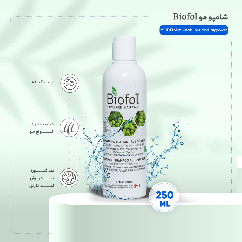 شامپو تخصصی درمانی بایوفول کانادا درمان کننده انواع الگوهای ریزش مو بوده و ضد ریزش، ضد پیری، تقویت فولیکول مو و رشد مجدد آن، ضخیم شدن تارهای مو، تقویت ساقه و پرپشت شدن آن را به همره دارد.