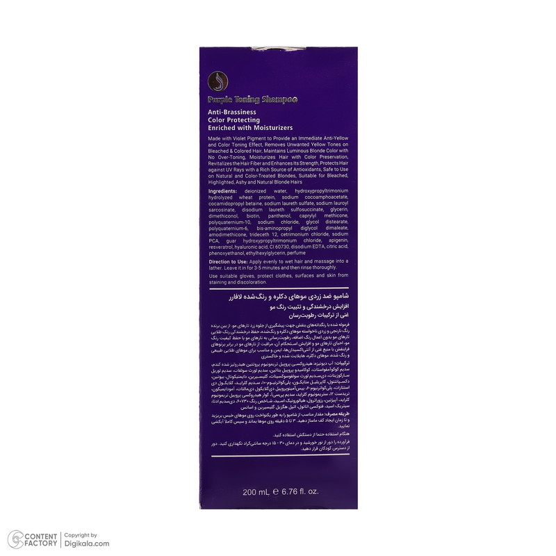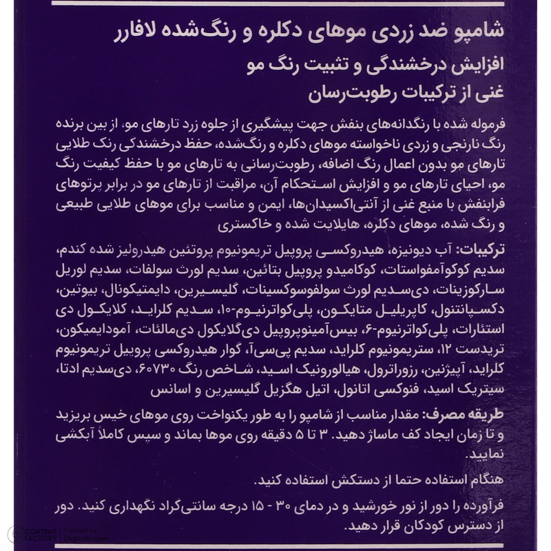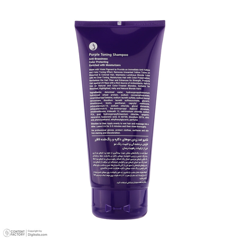 فرموله شده با رنگدانههای بنفش جهت پیشگیری از جلوه زرد تارهای مو/ از بین برنده رنگ نارنجی و زردی ناخواسته موهای دکلره و رنگ شده/ حفظ درخشندگی مو/ احیا کننده تارهای مو/ مراقبت از موها در برابر پرتوهای فرابنفش با منبع غنی از آنتی اکسیدانها.