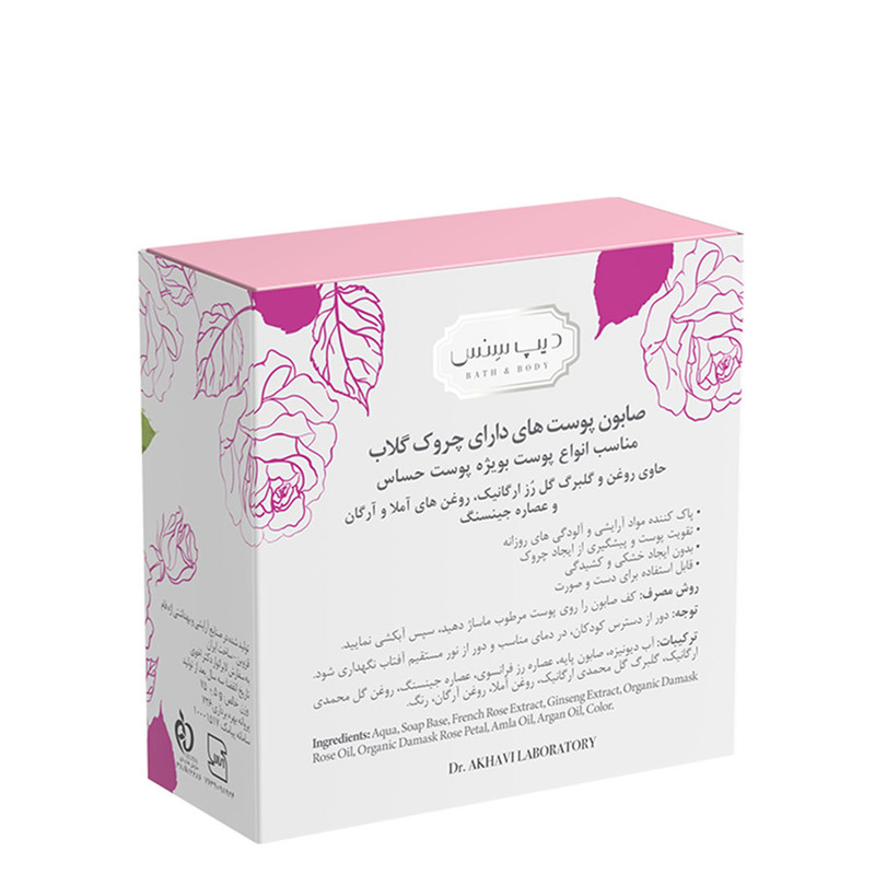 صابون پوست های دارای چروک گلاب دیپ سنس، پاک کننده آرایش و آلودگی دست و صورت می باشد که نه تنها حس خشکی ایجاد نمی کند، بلکه منجر به تقویت پوست و پیشگیری از ایجاد چروک نیز می گردد.