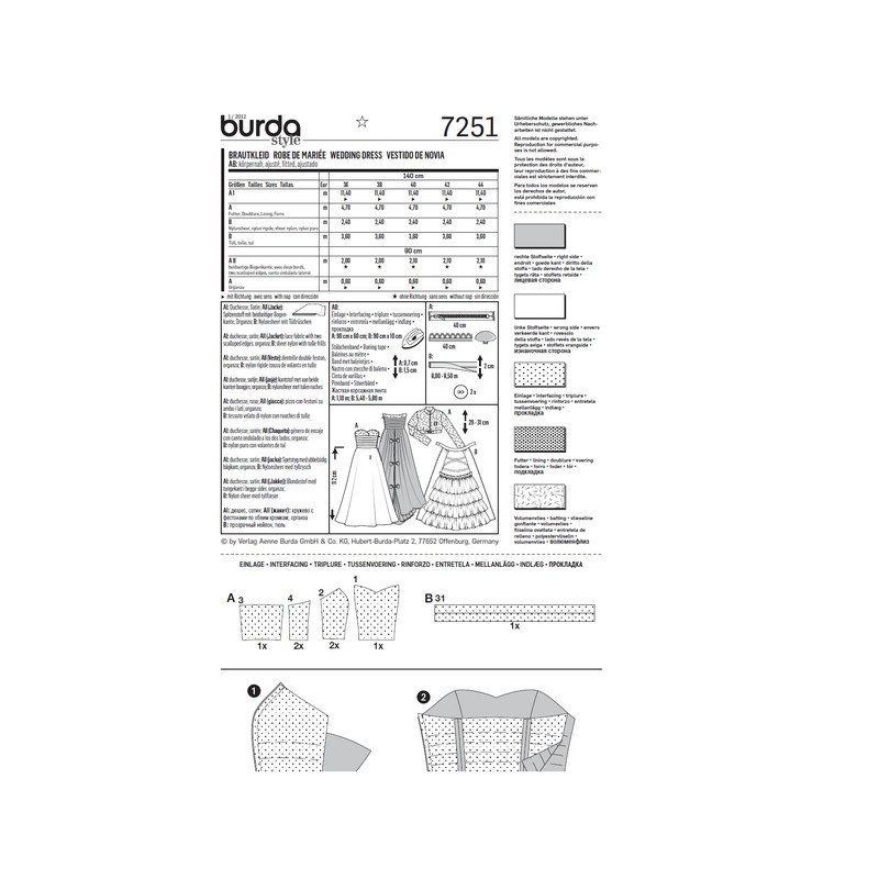 الگوی خیاطی لباس عروس بوردا استایل کد 7251 سایز 36 تا 44 متد مولر- محتوای این پکیج تولید شرکت بوردا است. الگوهای بوردا استایل چند سایزه هستند. دفترچه ی چند زبانه ی اصلی استفاده از الگو در این پکیج ارائه شده است. برای کاربران فارسی زبان راهنمای کلی استفاده از الگوها هم ارائه شده است.این الگوها در ابعاد واقعی لباس روی شیت بزرگ به صوت پلات چاپ شده و تصویرهای روی جلد به صورت الگوهای چند سایزه داخل بسته قرار دارند.