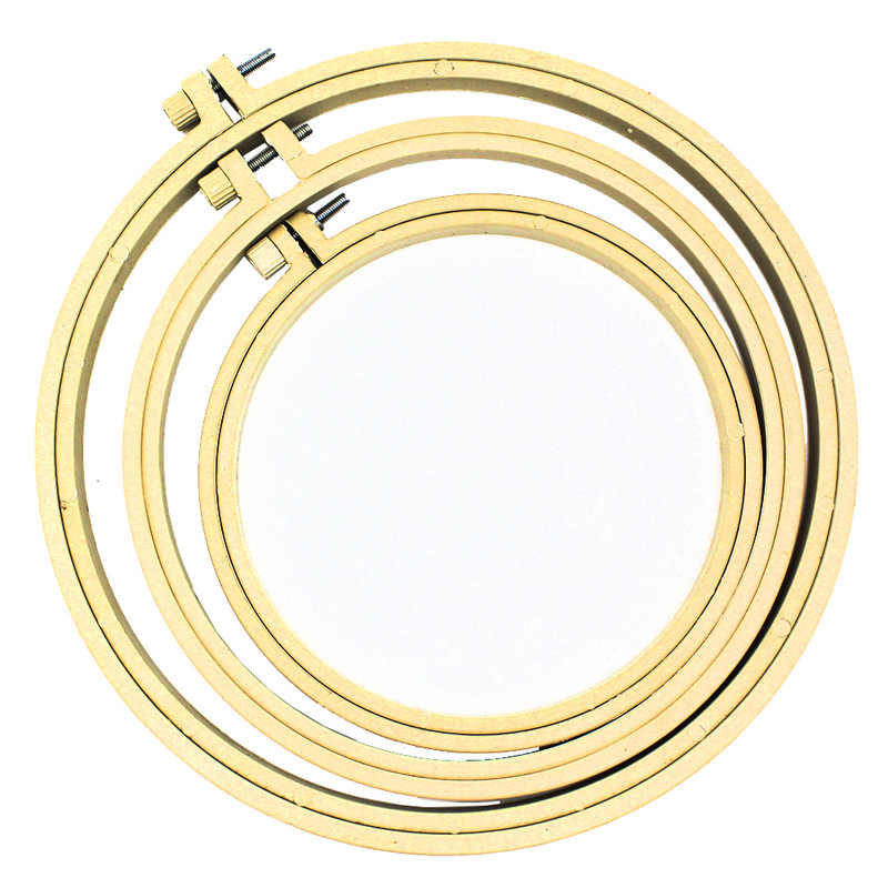 شامل 3 عدد کارگاه گلدوزی در سایزهای مختلف قطر کارگاه بزرگ 23 سانتی متر قطر کارگاه متوسط 19سانتی متر قطر کارگاه کوچک 15.5 سانتی متر