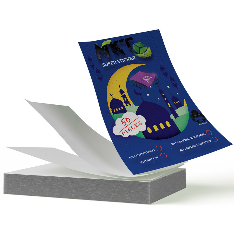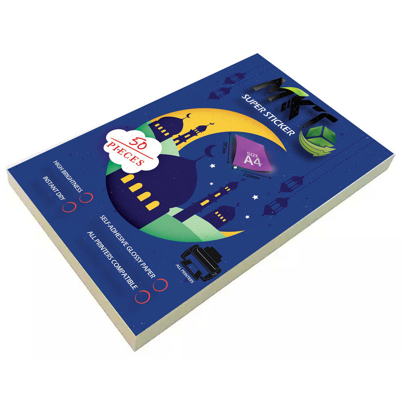 کاغذ فتوگلاسه پشت چسب دار (لیبل) براق MKT بسته 25 برگی مخصوص تمامی پرینترهای جوهرافشان و لیزری می باشد لیبل Label یا برچسب یا همان کاغذ پشت چسب دار MKT به چسب آغشته شده و یک روکش سیلیکونی زیر آن قرار گرفته و بعد از چاپ برداشته شده تا کاغذ روی سطوح مختلف قابل چسباندن شود. سطح سیلیکونی به رنگ زرد و سفید وجود دارد برخی از انواع این نوع کاغذها به دلیل نامرغوب بودن و اینکه زمان چاپ در اثر فشار چسب بین دو لایه بیرون میزند مناسب چاپ نیست بنابراین هنگام نیاز، نوع خوب آن را استفاده نمایید xx نکته : در زمان چاپ لیبل حتما باید تنظیمات پرینتر خود را برروی چاپ لیبل قرار دهید.