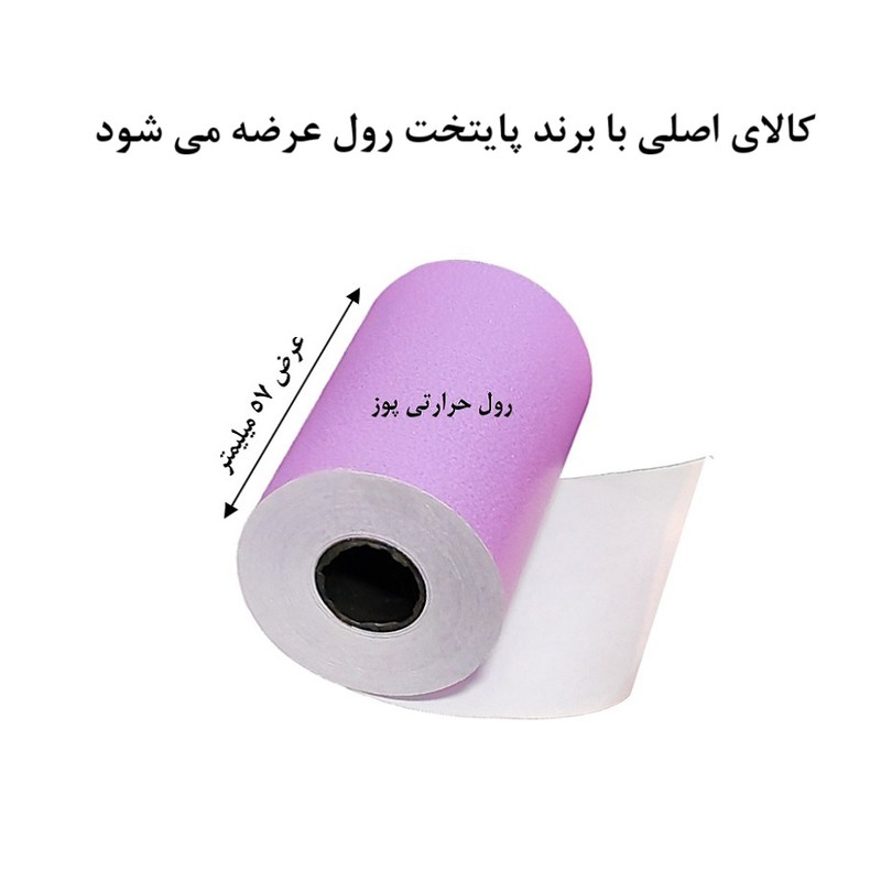 رول حرارتی پوز بنفش پایتخت رول، بدون چاپ در پشت رول، عرض ۵۷ میلی متر، مخصوص دستگاه های پوز و کارتخوان، رنگ کاغذ بنفش، رنگ چاپ مشکی، تعداد 5 عدد در پکیج فروش، کیفیت بالای کاغذ و برش عالی و بدون پرز، دارای لیبل اصالت کالای پایتخت رول