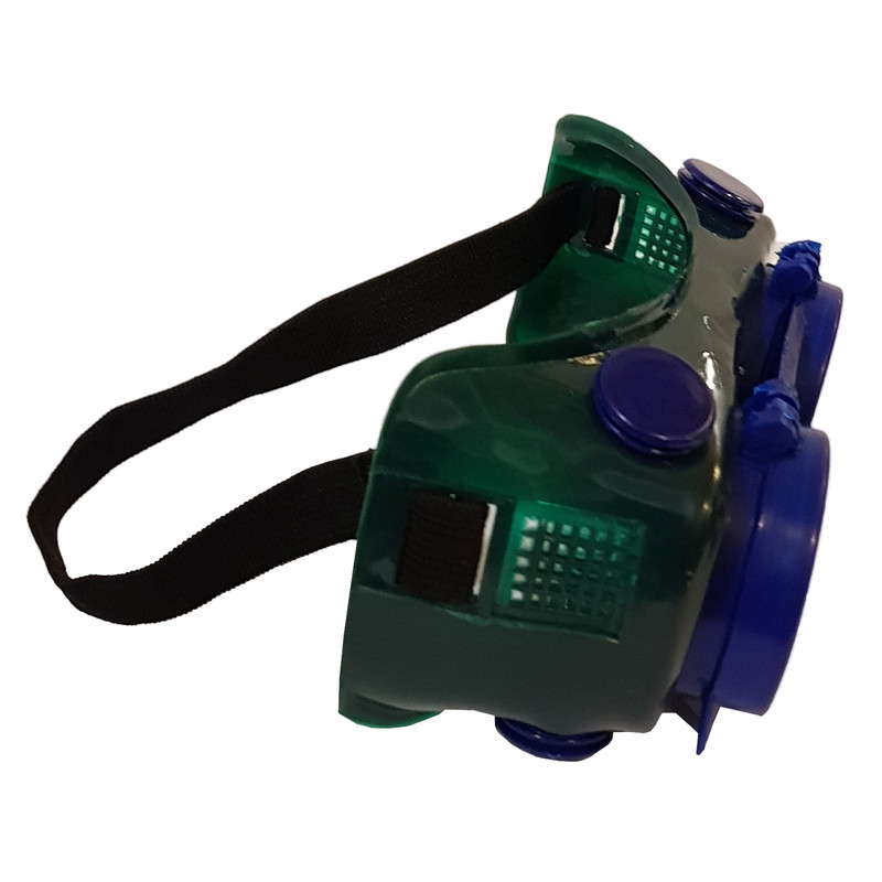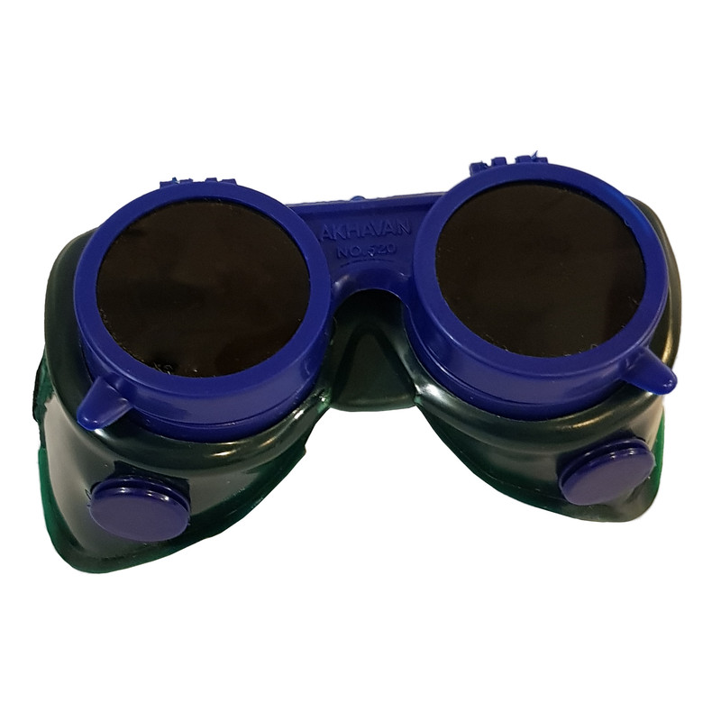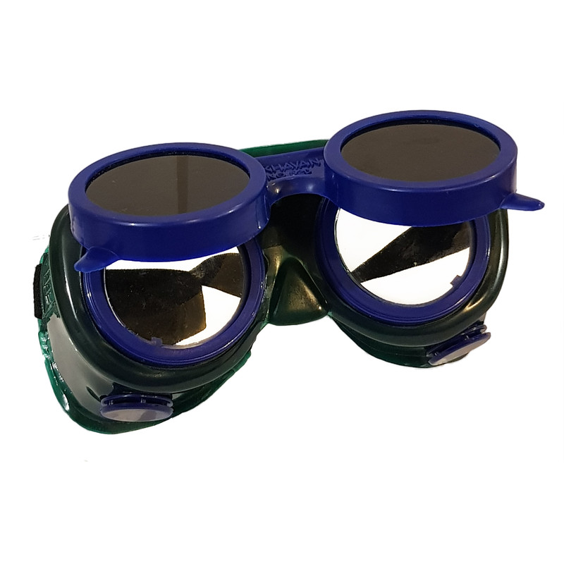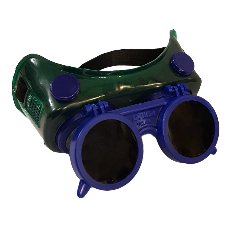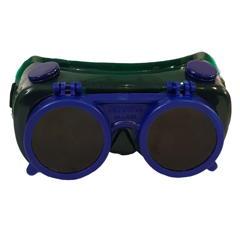 این عینک بصورت دو جداره است و قاب روی عینک بصورت متحرک بالا و پایین میرود تا بدون برداشتن عینک بتوان محیط کار را رویت کرد این عین با کش دور سر فیکس میشود