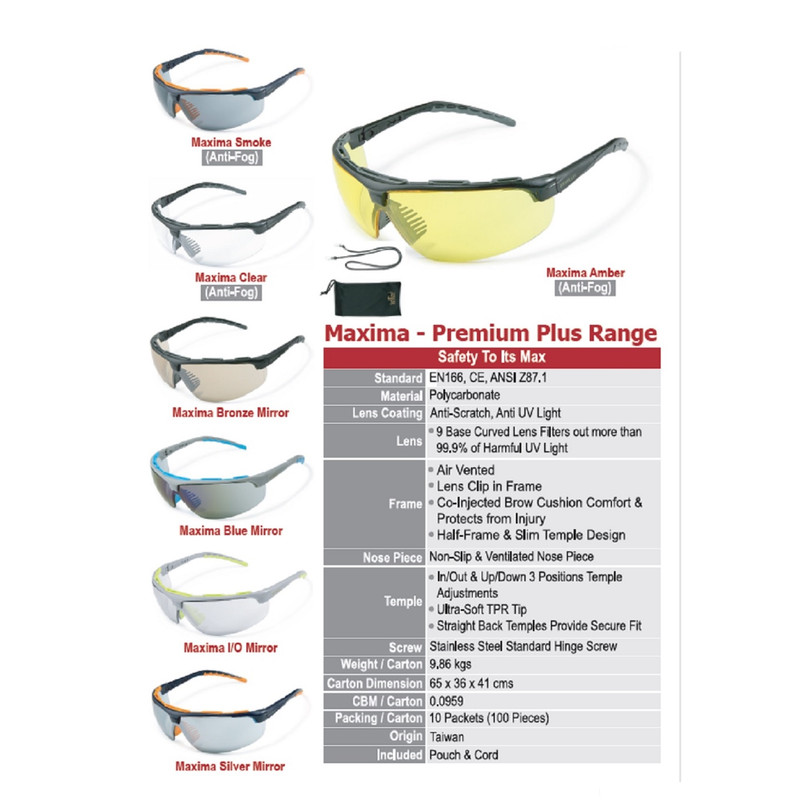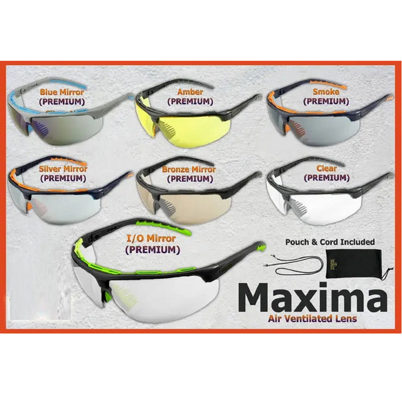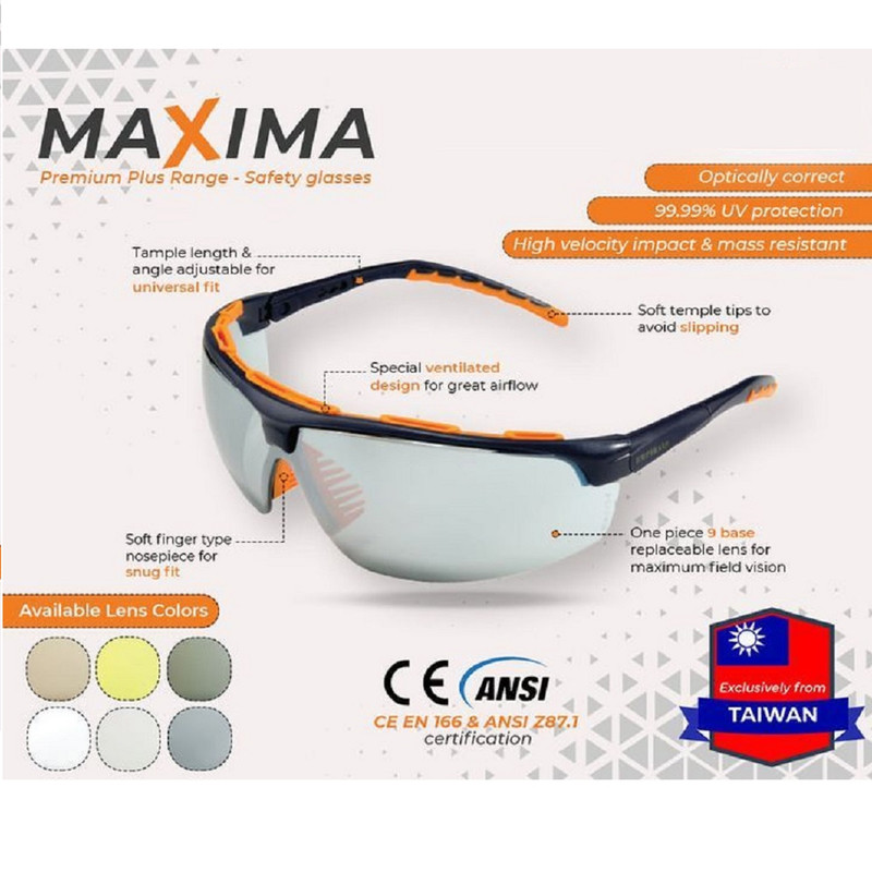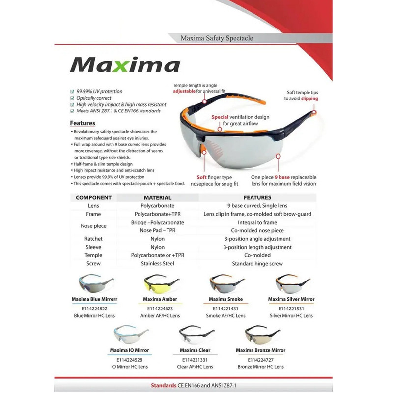 عینک های طبیعت گردی ، اسپرت ، ایمنی مدل MAXIMA محصولی با کیفیت بالا تولید شده در کشور تایوان می باشد . لنز این عینک ها از جنس پلی کربنات ضد خش تولید شده است که قدرت فیلتر کردن %99.9 اشعه مضر UV را دارد . لنز این مدل از عینک بصورت فریم دو تکه می باشد که درجه پوشش 9.5 را روی چشم ها دارا می باشد . این مدل از عینک بسیار سبک بوده و دارای 30 گرم وزن می باشد . پیچ لولا دسته ها از جنس فولاد ضد زنگ می باشد . قسمت قرارگیرنده بر روی بینی از جنس نرم و انعطاف پذیر بوده که باعث فشار و احساس ناخوشایند را از بین می برد .این عینک استانداردهای ANSI Z87.1, CE, EN166 را دارا می باشد .سایز این عینک ها فری سایز می باشد و دارای دسته های انعطاف پذیری می باشد . این محصول در 7 رنگ تولید می شود که خاصیت ضد مه/بخار ( ANTI FOG ) را دارا می باشند . رنگ های سبزآبی ، نقره ای ، کروم دارای خاصیت آینه ای می باشد که این رنگ را مناسب فعالیت در فضاهای داخلی و خارجی بصورت همزمان می کند . ( INDOOR & OUTDOOR ) . این لنز برای افرادی که بصورت مرتب بین فضاهای داخلی و بیرونی تردد می کنند طراحی شده است . رنگ زرد آن مناسب دید در شب می باشد . دسته های این مدل عینک کشویی بوده و قابلیت بلند تر شدن دارند . همچنین در بخش لولا هم زاویه پذیر و ممتحرک می باشند .