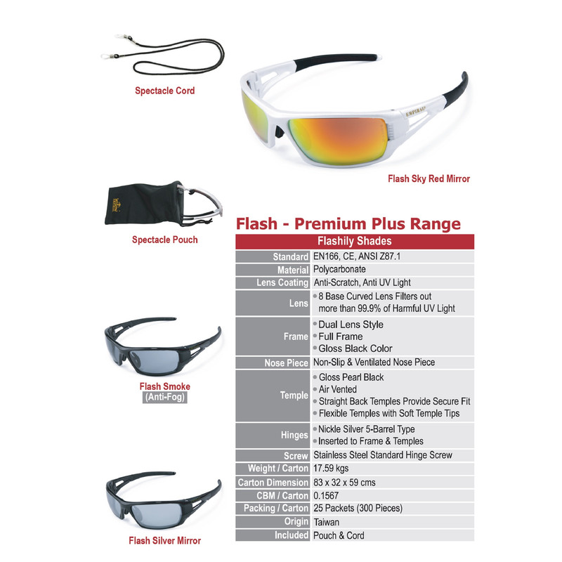 عینک های , ایمنی ، طبیعت گردی ، اسپرت ، محصولی با کیفیت تولید شده در کشور تایوان می باشد . لنز این عینک ها از جنس پلی کربنات ضد خش تولید شده است که قدرت فیلتر کردن %99.9 اشعه مضر UV را دارد . لنز این مدل از عینک ( FLASH ) بصورت دو تکه می باشد که درجه پوشش 8 را روی چشم ها دارا می باشد . این مدل از عینک سبک بوده و تنها دارای 35 گرم وزن می باشد . پیچ لولا دسته ها از جنس فولاد ضد زنگ می باشد . قسمت قرارگیرنده بر روی بینی از جنس نرم و انعطاف پذیر بوده که باعث فشار و احساس ناخوشایند را از بین می برد .این عینک استانداردهای EN166 FCE, ANSI Z87.1 را دارا می باشد .سایز این عینک ها فری سایز می باشد و دارای دسته های انعطاف پذیری می باشد . این محصول در 6 رنگ تولید می شود که رنگهای ( دودی - زرد - شفاف ) خاصیت ضد مه/بخار ( ANTI FOG ) را دارا می باشند . رنگ فریم نارنجی فسفری دارای خاصیت آینه ای می باشد که این رنگ را مناسب فعالیت در فضاها با نور زیاد همانند روزهای برفی و پیست های اسکی می باشد .