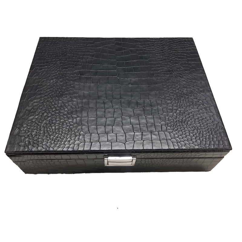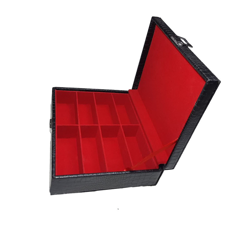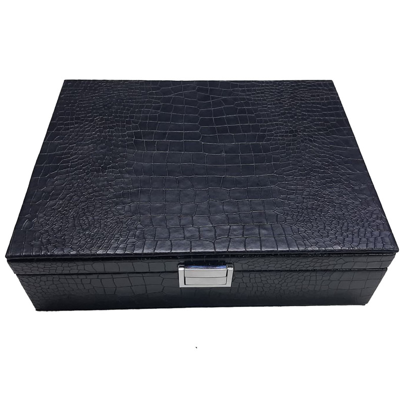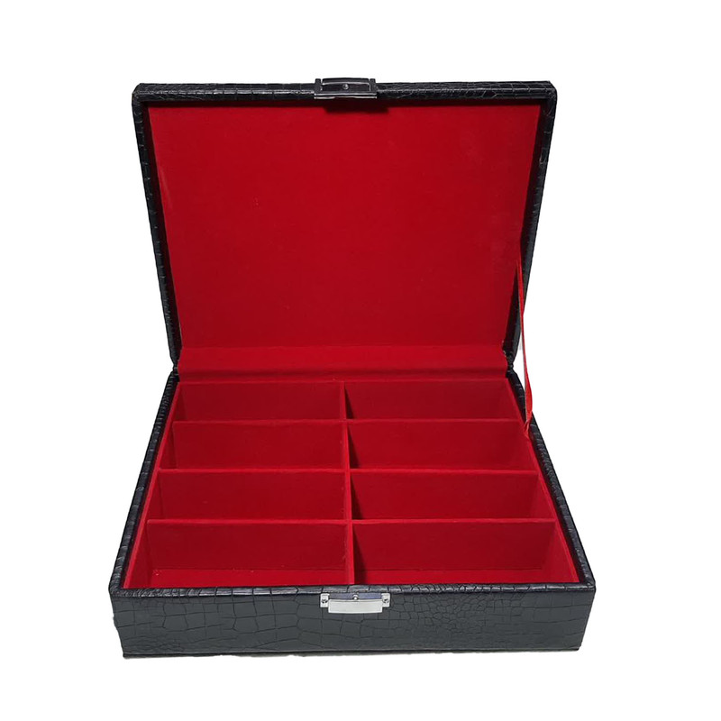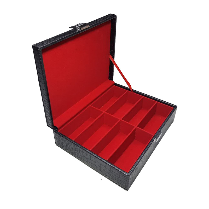 جعبه عینک ساخته شده با دیواره های چوبی به قطر 6 میل می باشد . روکش چرم مصنوعی می باشد . آستر داخلی جیر می باشد . مخصوص نگهداری 8 عدد عینک می باشد . چرم روکش طرح کروکودیلی می باشد .