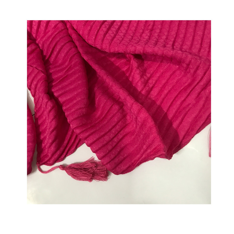 شال پلیسه صدفی ، در 20 رنگ موجود می باشد جنس این شال نخ پنبه درجه یک بوده است و نرمی فوق العاده دارد .عرض کار 80 سانتی است . دور دوخت و منگوله دار است .