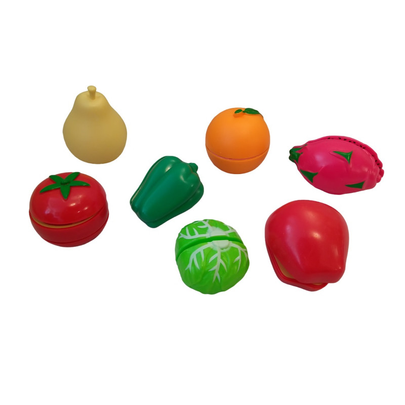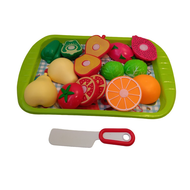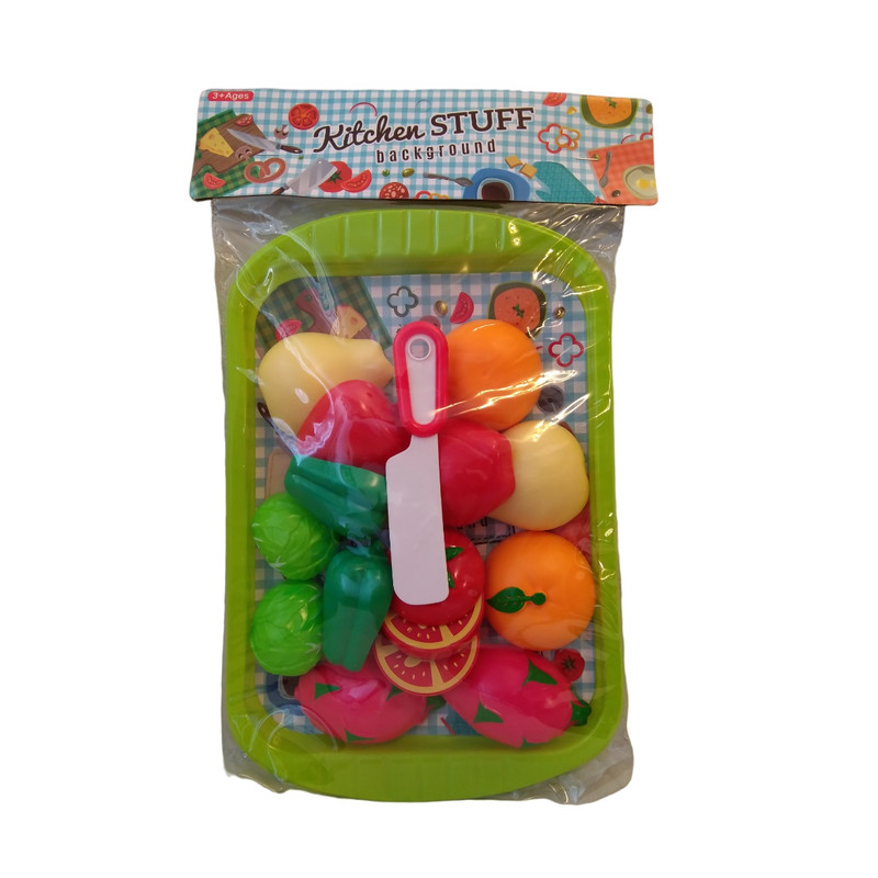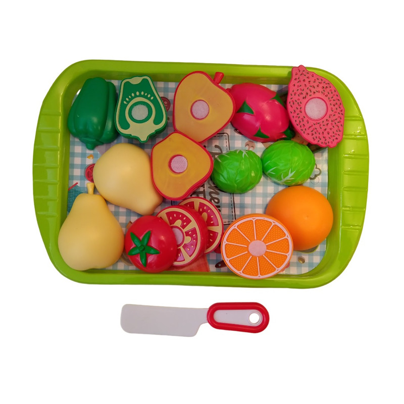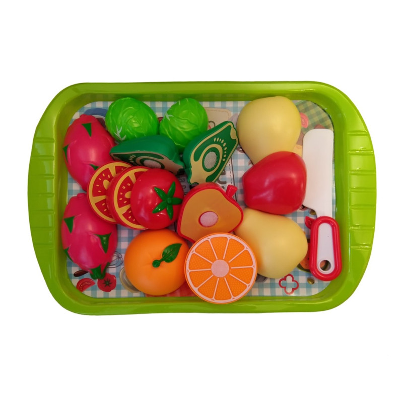 7 عدد میوه و سبزیجات که همه آنها قابل برش و اتصال مجدد میباشد و کارد , سینی