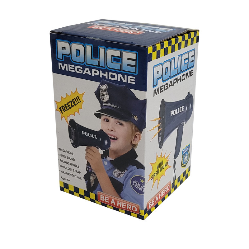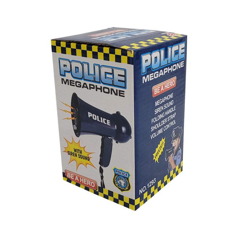 ساخته شده از پلاستیک دارای میکروفن دارای بلند با صدای بلند ( فوق قوی ) قابلیت تنظیم صدا ( کم و زیاد کردن ) قابلیت پخش صدای آژیر پلیس نیاز به 4 عددی باتری قلمی ( ناموجود در بسته بندی ) دارای بسته بندی جعبه ای مناسب هدیه