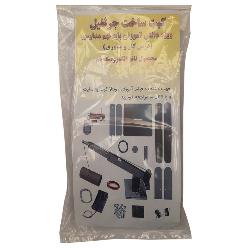 کیت جرثقیل و یا به عبارت دیگر کیت جرثقال از نمونه کارهای عملی دانش آموزان در مقطع نهم تحصیلی می باشد. در این کارعملی دانش آموزان بار دیگر با ارتباط مکانیک و الکترونیک آشنا شده و چگونگی رفع چالش های آینده کاری خود را تمرین می کنند. از طرفی با کاربرد نرم افزار در علوم فنی مهندسی آشنا شده ، طراحی و اجرای آنچه در ذهن خود دارند را فرا می گیرند. این کیت که از برشهای دقیق چوبی توسط دستگاه لیزر تهیه شده به همراه لوازم مرغوب دیگر از جمله پیچ و مهره-گیربکس و موتور-جاباتری قلمی-برد الکترونیکی-سیم-میکروسوئیچ-نخ و قلاب در بسته بندی ویژه عرضه میگردد .با توجه به فرایند آموزشی معرفی شده در کیت میتوانید به آسانی این کیت را مونتاژ نمایید و از ساخت این مدل جرثقیل لذت ببرید.
