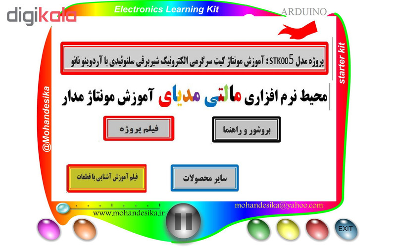 یکی از قطعات پر کاربرد الکترونیک در منزل کلیدهای قطع و وصل هستند که با استفاده از آنها فرامین خاموش یا روشن به مدار کنترلی ارسال میگردد از جمله شیر قطع و وصل برقی سلنوئیدی (Solenoid Valve) است که راه اندازی و آشنایی با عملکرد آن در این کیت به سادگی آموزش داده می شود و با استفاده از ماژول کنترل کننده آردوینو نانو ( Arduino Nano ) جهت آبیاری گل وگیاه و یا سایر کاربردها مانند شیر آب یا قطع و وصل مایعات کاربرد دارد. و شما بدون نیاز به تخصص بالای الکترونیک پروژه های الکترونیک را می توانید بسازید و آموزش ببینید . در این بسته الکترونیکی ماژولهای لازم به صورت نمونه آزمایشگاهی به همراه CD آموزش مالتی مدیا جهت علاقه مندان ارائه میگردد که علاوه بر سرگرمی و لذت بردن از مدارات الکترونیک کاربرد آموزشی نیز دارد توجه داشته باشید در این بسته قطعات بصورت مجزا ارائه میشود و خریدار میتواند با استفاده از CD آموزش ارائه شده قطعات وماژولها را روی برد بورد (breadboard) مونتاژ نماید .مونتاژ برروی برد بورد (breadboard) مزایای زیادی برای کاربران دارد که در بردهای مدارچاپی امکان ندارد از جمله بازگشت و اصلاح مدار ویا استفاده از قطعات یا ماژولها در سایر طرحها و همچنین امکان مونتاژ و دمونتاژ مدار به کرات ، این روش برای علاقه مندان که بصورت آزمایشگاهی مدارات مونتاژ میشوند بهترین روش آموزشی در یادگیری است.این بسته به همراه CD آموزش مالتی مدیای مونتاژ مدار ارائه میگردد.