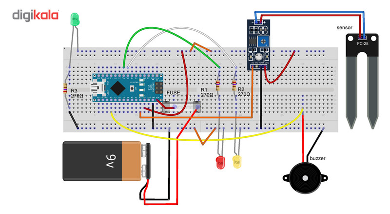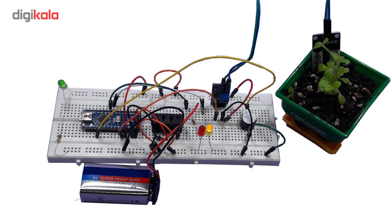کیت سرگرمی ،آموزشی AD007 طرح آلارم آبیاری گل وباغچه با ماژول آردوینو نانو ارائه شده است. با استفاده از سنسور رطوبت خاک میزان رطوبت خاک اندازه گیری میشود . وقتی خاک باغچه یا گلدان خشک باشد LED قرمز روشن شده و صدای آلارم بازر زده خواهد شد. پس از آبیاری خاک سنسور رطوبت پیام لازم را به ماژول آردوینو ارسال میکند و صدای آلارم قطع شده و LED زرد روشن می شود . این مجموعه علاوه بر آموزش موجب سرگرمی علاقه مندان با الکترونیک خواهد شد . قطعات و ماژولهای این مجموعه جهت استفاده در سایر مدارات نیز کاربرد دارد و در صورت آشنایی با نرم افزار آردوینو امکان پروگرام کردن ماژول آردوینو نانو برای سایر طرح ها توسط کابل اتصال USB مقدور است . توجه داشته باشید در این بسته قطعات بصورت مجزا ارائه میشود و خریدار میتواند با استفاده از بروشور ارائه شده قطعات وماژولها را روی برد بورد (breadboard) مونتاژ نماید لذا ارائه تصویر وعکس کیت مونتاژ شده در فروشگاه جهت راهنمایی خریداران است .مونتاژ برروی برد بورد (breadboard) مزایای زیادی برای کاربران دارد که در بردهای مدارچاپی امکان ندارد از جمله بازگشت و اصلاح مدار ویا استفاده از قطعات یا ماژولها در سایر طرحها و همچنین امکان مونتاژ و دمونتاژ مدار به کرات برای علاقه مندان این روش که بصورت آزمایشگاهی مدارات مونتاژ میشوند بهترین روش آموزشی در یادگیری است.این بسته به همراه CD آموزش مونتاژ مدار ارائه میگردد.
