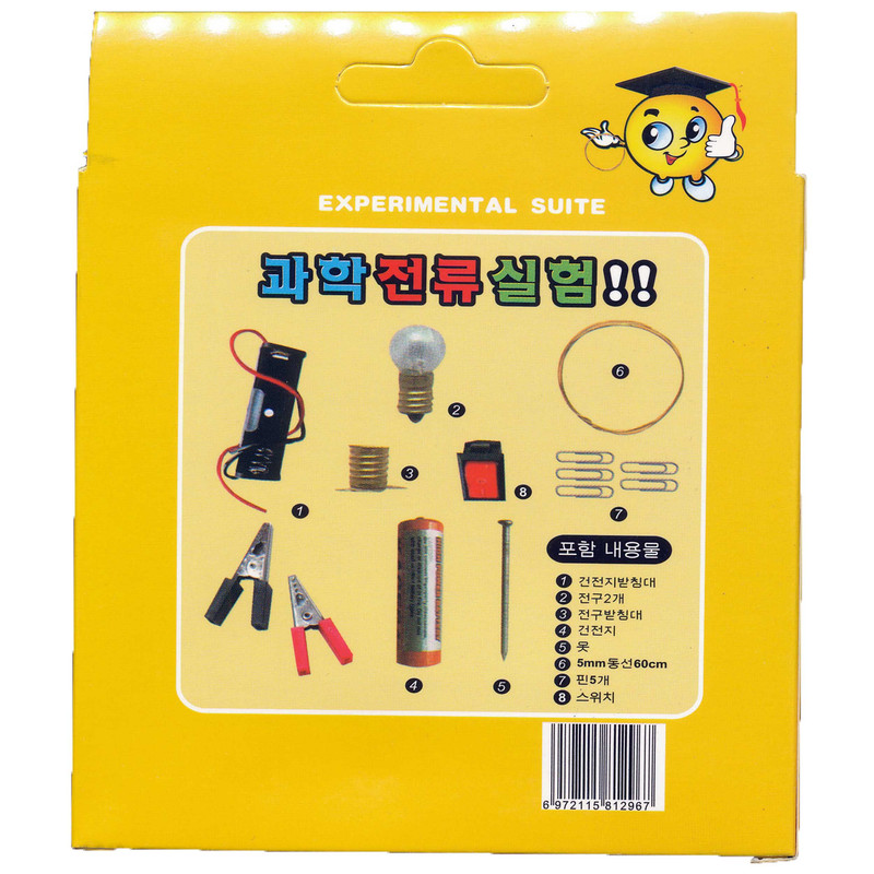 دارای جا باتری ، لامپ ، سرپیچ ، باتری ، میخ ، تکه ای سیم ، دو عدد گیره کاغذ ، کلید و دو عدد سوسماری