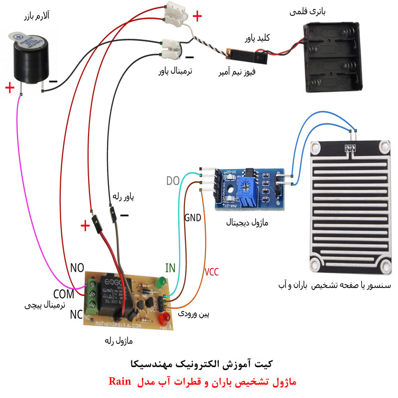 کیت آموزش الکترونیک دانش آموزی مهندسیکا یک کیت ساده سرگرمی،آموزشی است که دانش آموزان و نوجوانان را با ماژولها و مدارات الکترونیک و کنترلی آشنا میکند در این کیت هدف آشنایی و اجرای پروژهای کاربردی الکترونیکی بدون نیاز به لحیم کاری یا برنامه نویسی است .جهت انجام یک کار پژوهشی علمی و سرگرم کننده برای دانش آموزان است. ماژولهای لازم به صورت نمونه آزمایشگاهی به همراه فیلم آموزش جهت علاقه مندان ارائه میگردد که علاوه بر سرگرمی و لذت بردن از مدارات الکترونیک کاربرد آموزشی نیز دارد.با استفاده از این ماژول می توانید بارش یا عدم بارش باران را تشخیص دهید. ماژول حسگر باران و قطرات دارای دو بخش است. بخش اول یک برد مدار چاپی است که دارای شبکه ای از مسیر های مسی می باشد. با قرار گرفتن یک رسانا روی این برد (مثل قطرات آب)، بخشی از این مسیرها به یکدیگر وصل می شود و مقاومت کلی برد کاهش می یابد. بخش دوم، یک برد ماژول دیجیتال برای راه اندازی قسمت اول است. در این برد از یک مقایسه گر برای تبدیل خروجی آنالوگ، به خروجی دیجیتال استفاده شده است. حساسیت این مقایسه گر را می توانید با استفاده از پتانسیومتری که روی برد قرار دارد تنظیم کنید. سنسور به همراه یک رله به کار گرفته شده تا قابلیت فعال کردن یک سیستم آلارم هوشمند ، یا بسته شدن دریچه یا پنجره ها در مواقع بارانی همانند خانه های هوشمند را داشته باشد بر روی ماژول دو LED نمایشگر می باشد که یکی مربوط به تغذیه و دیگری وضعیت خروجی دیجیتال سنسور را مشخص میکند. توجه داشته باشید قطعات بصورت مجزا ارائه میشود و خریدار میتواند با استفاده از فایل آموزشی ارائه شده ، قطعات و ماژولها را مونتاژ نماید لذا ارائه تصویر وعکس کیت مونتاژ شده در فروشگاه جهت راهنمایی خریداران است مونتاژ بصورت آزمایشگاهی مزایای زیادی برای کاربران دارد که در بردهای مدارچاپی امکان ندارد از جمله بازگشت و اصلاح مدار ویا استفاده از قطعات یا ماژولها در سایر طرحها و همچنین امکان مونتاژ و دمونتاژ مدار به دفعات، برای علاقه مندان این روش که بصورت آزمایشگاهی مدارات مونتاژ میشوند بهترین روش آموزشی در یادگیری است.این بسته به همراه DVD، آموزش مونتاژ مدار ارائه میگردد.جهت راه اندازی کیت چهار عدد باتری قلمی یک و نیم ولت استاندارد تهیه شود .کیت کاربرد سرگرمی آموزشی دارد .