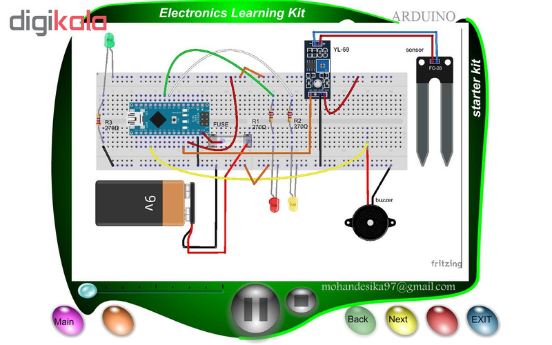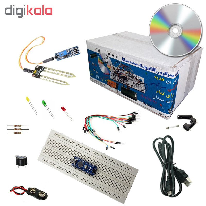 کیت سرگرمی الکترونیک مدل AT007 مهندسیکا شامل قطعات وماژولهای لازم جهت آموزش علاقه مندان به مونتاژ و راه اندازی کیت بصورت نمونه آزمایشگاهی پروژه آلارم آبیاری گل وباغچه طراحی شده است. این مدل همانند مدل AD007 میباشد با این تفاوت که ماژولها بر روی بردبورد نصب هستند و میتوانید آموزش یادگیری را از نمونه مونتاژ شده که آماده به کار است شروع نمایید. با استفاده از سنسور رطوبت خاک میزان رطوبت خاک اندازه گیری میشود . وقتی خاک باغچه یا گلدان خشک باشد LED قرمز روشن شده و صدای آلارم بازر زده خواهد شد. پس از آبیاری خاک سنسور رطوبت پیام لازم را به ماژول آردوینو ارسال میکند و صدای آلارم قطع شده و LED زرد روشن می شود . مزایای کیت : این مجموعه علاوه بر آموزش موجب سرگرمی علاقه مندان با الکترونیک خواهد شد، قطعات و ماژولهای این مجموعه جهت استفاده در سایر مدارات نیز کاربرد دارد.در صورت آشنایی با نرم افزار آردوینو امکان پروگرام کردن ماژول آردوینو نانو برای سایر طرح ها توسط کابل اتصال USB مقدور است مونتاژ برروی برد بورد (breadboard) صورت میگیرد وامکان بازگشت و اصلاح مدار به راحتی است همچنین امکان مونتاژ و دمونتاژ مدار به کرات ممکن است و بهترین روش آموزشی در یادگیری است. با استفاده از CD آموزش مالتی مدیا ارائه شده قطعات وماژولها را به راحتی روی برد بورد (breadboard) مونتاژ نمایید . این محصول بصورت مونتاژ شده در بسته بندی کارتنی به همراه CD آموزش مالتی مدیا مونتاژ مدار ارائه میگردد.