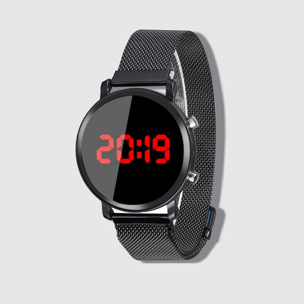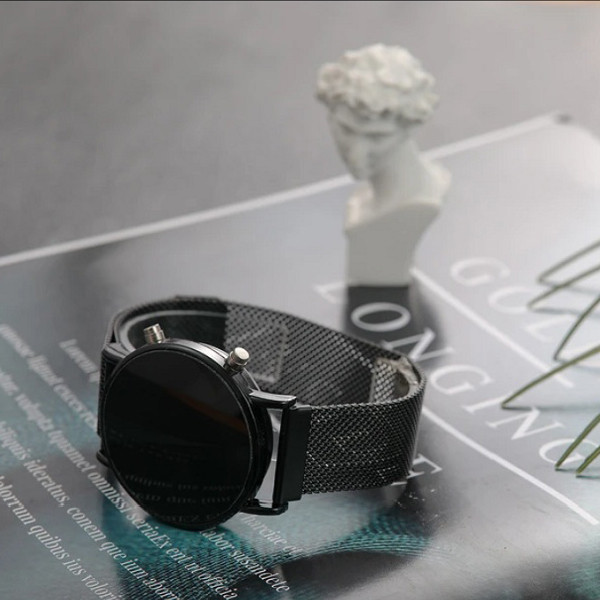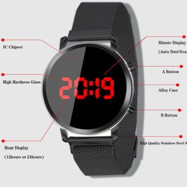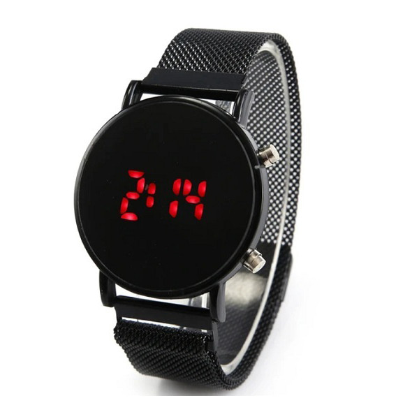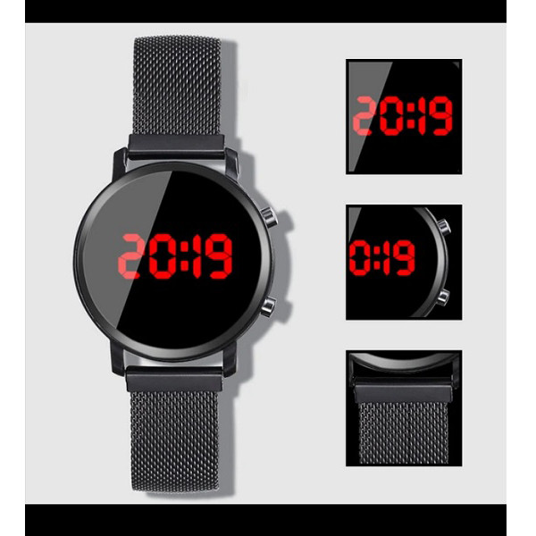 ساعت پیش روی شما یک ساعت دیجیتال با شکل و شمایل ساعت های هوشمند است این ساعت تمام فلز می باشد و قفل آن به صورت مگنتی عمل میکند این به دلیل شباهتش با ساعت های هوشمند از طرفداران زیادی برخوردار است و از نقاط قوت این ساعت چراغ های بزرگ و پرنور جهت نمایش ساعت است