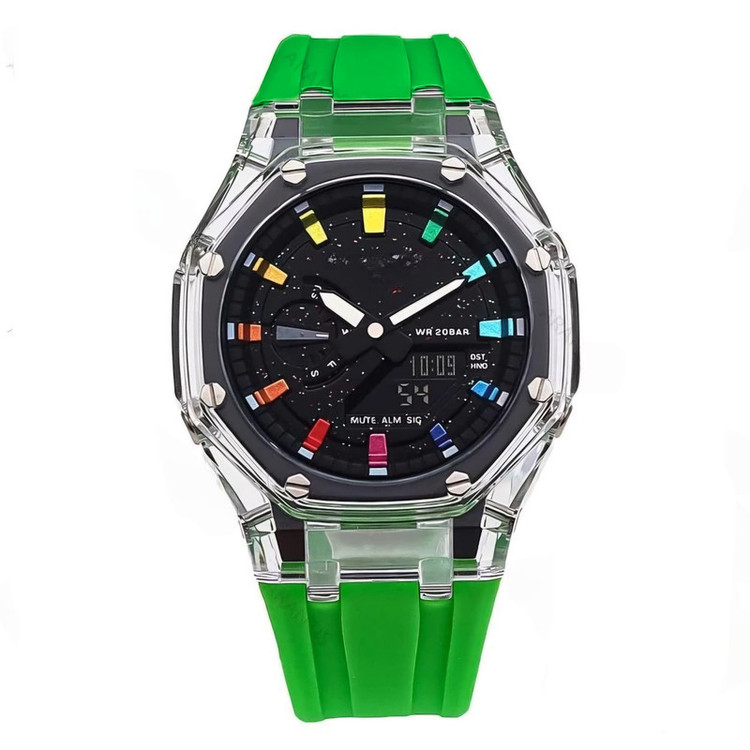 تایمر , صفحه طرحدار , عقربههای شبتاب , نمایش 24 ساعته , نمایش ساعت دوم , نور پس زمینه , تاریخ شمار , آلارم , کرنوگراف , شیشه ضدخش , ضد آب , شیشه ضد انعکاس