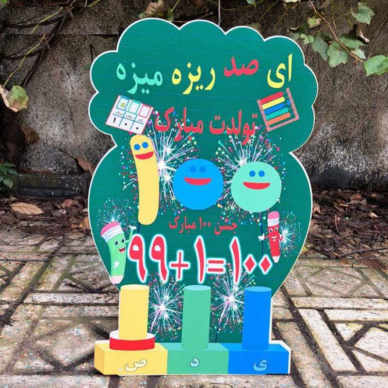 8 عدد پرچم ریسه، 3 عدد بادکنک فویلی اعداد نماد جشن 100 و یک عدد استند ایستاده چوبی 30 سانتی