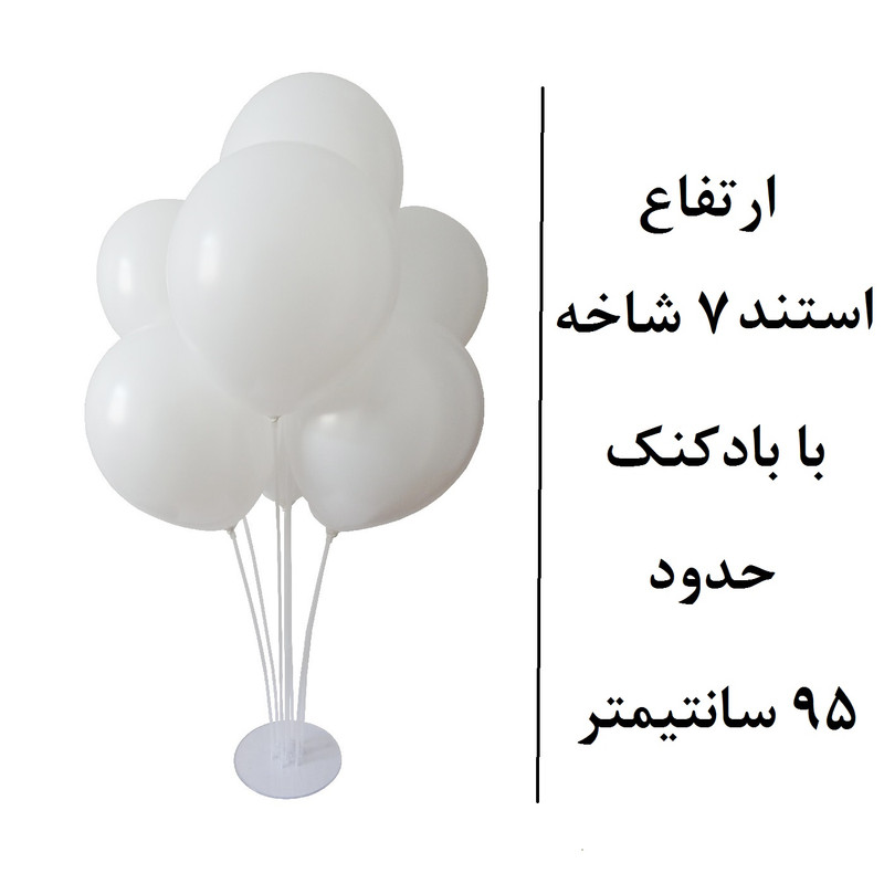 2 عدد استند ارسالی 7 شاخه می باشد. ارتفاع شاخه وسط بدون بادکنک : 65 سانتیمتر ارتفاع شاخه وسط با بادکنک حدود 95 سانتیمتر کفی استند مشکی رنگ می باشد. شاخه های استند تک رنگ به با عنوان بی رنگ ارسال میشود.