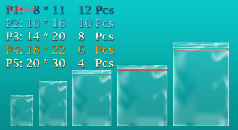 سایر توضیحات : بسته شامل : _ 12 عدد کیسه زیپ دار به ابعاد 8*11 سانتی متر _ 10 عدد کیسه زیپ دار به ابعاد 10*16 سانتی متر _ 8 عدد کیسه زیپ دار به ابعاد 14*20 سانتی متر _ 6 عدد کیسه زیپ دار به ابعاد 18*22 سانتی متر _ 4 عدد کیسه زیپ دار به ابعاد 20*30 سانتی متر