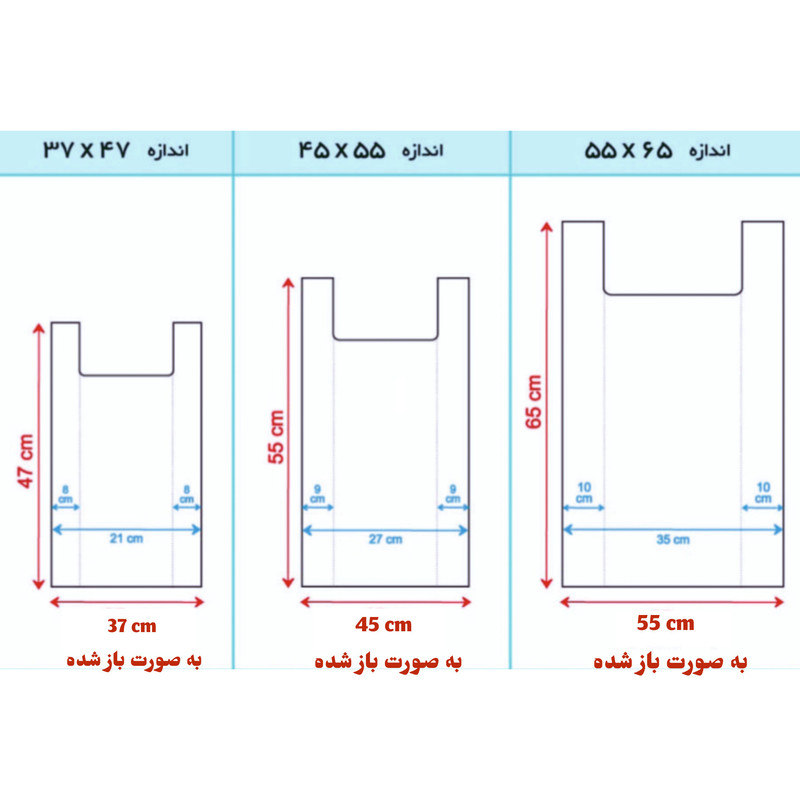 کیسه پلاستیک دسته دار تهیه شده از مواد درجه یک مجموعه ۱۰۰ عددی در سه سایز مختلف بزرگ ۱۰ عدد متوسط ۴۰ عدد کوچک ۵۰ عدد