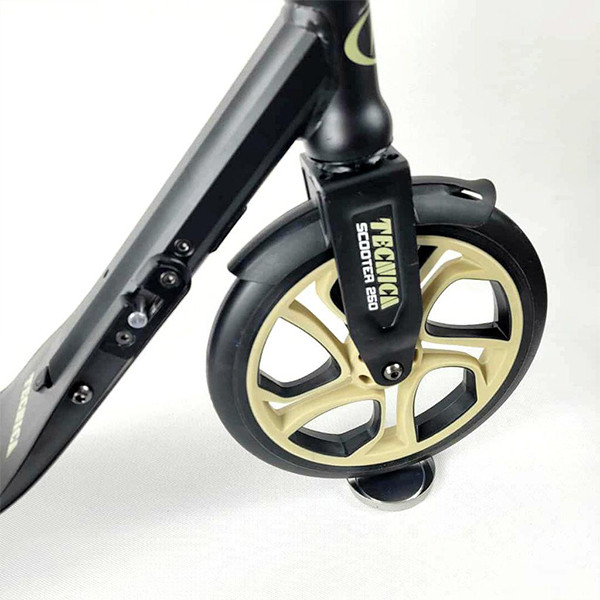 اسكوتر حرفه ای تکنیکا TECNICA S250باطراحي منحصر به فرد وهارموني خاص خود خيلي سريع به يكي از پرفروشترين اسكوترهاي بزرگسال تبديل شد.از مزاياي اسكوتر تکنیکا S250 ميتوان به چرخهاي 250 ميليمتري آن كه عبور از تمام موانع را راحت كرده و استحکام بالا و تحمل وزن تا 170 کیلوگرم نام برد.جنس چرخهای اسکوتر TECNICA از نوع پلی اورتانی میباشد که طول عمر بالای چرخها و همچنین عدم سر خوردن بر روی سطوح لیز از ویژگی آن میباشد.ارتفاع دسته اسکوتر قابلیت تنظیم در سه حالت را دارد و مناسب رده سنی 7 سال تا 60 سال میباشد.همچنین شما میتوانید با فشردن اهرم روی بدنه اسکوتر را جمع کرده و به راحتی در صندوق ماشین و یا فضاهای کوچک قرار دهید. بدنه آلیاژی سبک و مقاوم،دسته قابل تنظیم،چرخهای بزرگ و روان دلایل کافی برای خرید اسکوتر بزرگسال تکنیکا به شمار میاد.