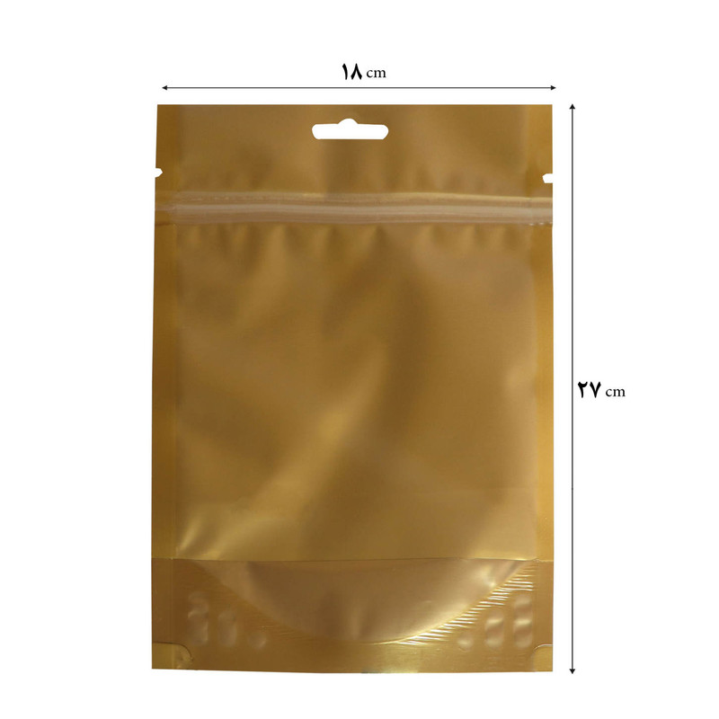 پاکت زیپ دار ایستاده مدل 1827, روی پاکت شفاف و داخل پاکت طلایی و پشت آن نقره ای می باشد. با ابعاد 27 سانتیمتر در ارتفاع و 18 سانتیمتر در عرض است. درب پاکت زیپ دار به صورت آسان بازشو هست و میتوان موادی همچون غذای سرد , میوه , سالاد , قهوه , چای و سایر موارد را در آن قرار داد. ابعاد داخلی پاکت 20 سانتیمتر در 16 سانتیمتر هست. در بالای پاکت یک پانچ کلاهی قرار دارد. این محصول به صورت تعداد 30 عددی عرضه میشود.