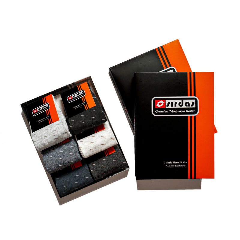 ۶ جفت جوراب با طرح یکسان و در ۶ رنگ مختلف داخل جعبه ۶ عددی وجود دارد